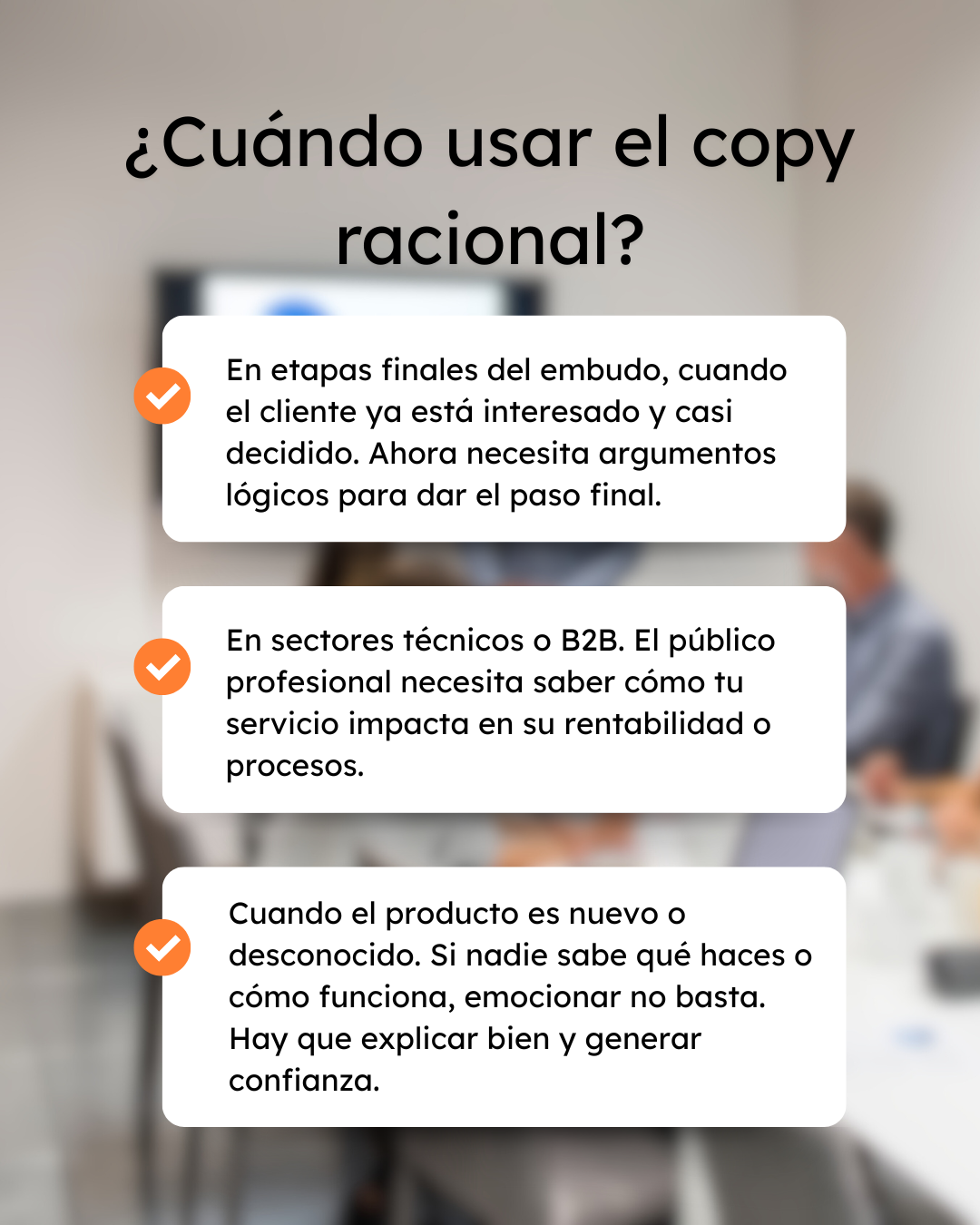 Por otro lado, el copy racional convence con hechos, beneficios concretos y argumentos lógicos. Es esencial para productos o servicios con alta inversión, públicos técnicos o decisiones muy meditadas. Pero si te limitas a los datos, puedes sonar frío, plano… incluso aburrido. Y nadie compra aburrimiento.